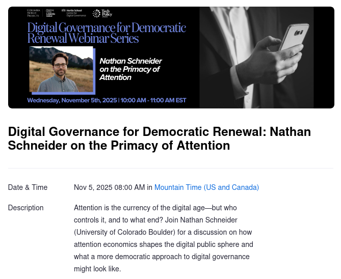 How can we calibrate online democracy for the attention economy? On November 5, I’ll be doing a virtual lecture for Columbia University on my new co-authored paper, “Online Governance Surfaces and Attention Economies.”